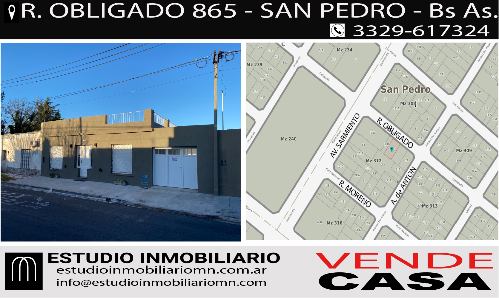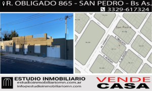 !!! CASA EN VENTA – A ESTRENAR – SAN PEDRO !!! * Rafael Obligado N° 855 Distribuida en.. Living Comedor Cocina 3 Dormitorios Baño completo Patio Grande Parrilla Baño completo en zona de parrilla Cochera cubierta con pasante al patio Todos los Servicios ** REFACCIONADA A NUEVA ** A ESTRENAR ** Muy Buena Ubicación, a pocas cuadras del centro de la ciudad y a metros de Av. Sarmiento * ESRITURA INMEDIATA * Superficie Terreno 500m2 VALOR: A Consultar